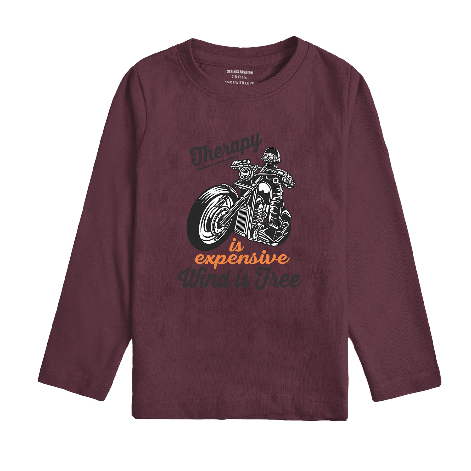 This burgundy boys' long sleeve T-shirt is crafted from 100% cotton, ensuring softness and breathability for all-day comfort. Featuring a stylish bike print, it combines playful design with durable fabric, making it ideal for active children. The long sleeves provide added warmth, perfect for cooler days while maintaining a lightweight feel. This T-shirt offers both practicality and style for young boys.