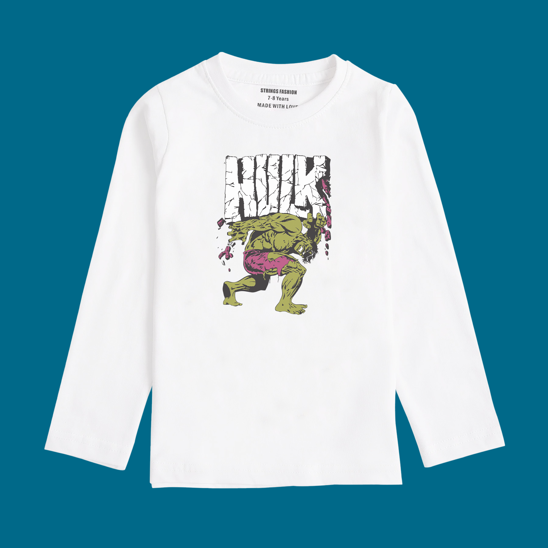 This boys' long sleeve T-shirt features a vibrant Hulk print on crisp white, made from 100% cotton for breathable comfort and durability. Its soft fabric ensures all-day wearability, while the classic long sleeves provide added warmth and style. Ideal for active kids, this T-shirt combines playful design with practical comfort.