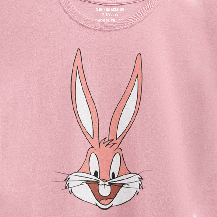 This girls' T-shirt features a vibrant digital print of Bug Bunny in a playful "Tickled Pink" design. Crafted from 100% cotton, it ensures breathability and comfort for active wear. The soft fabric and bright colors make it an ideal choice for everyday casual wear, combining style with durability for young fans.