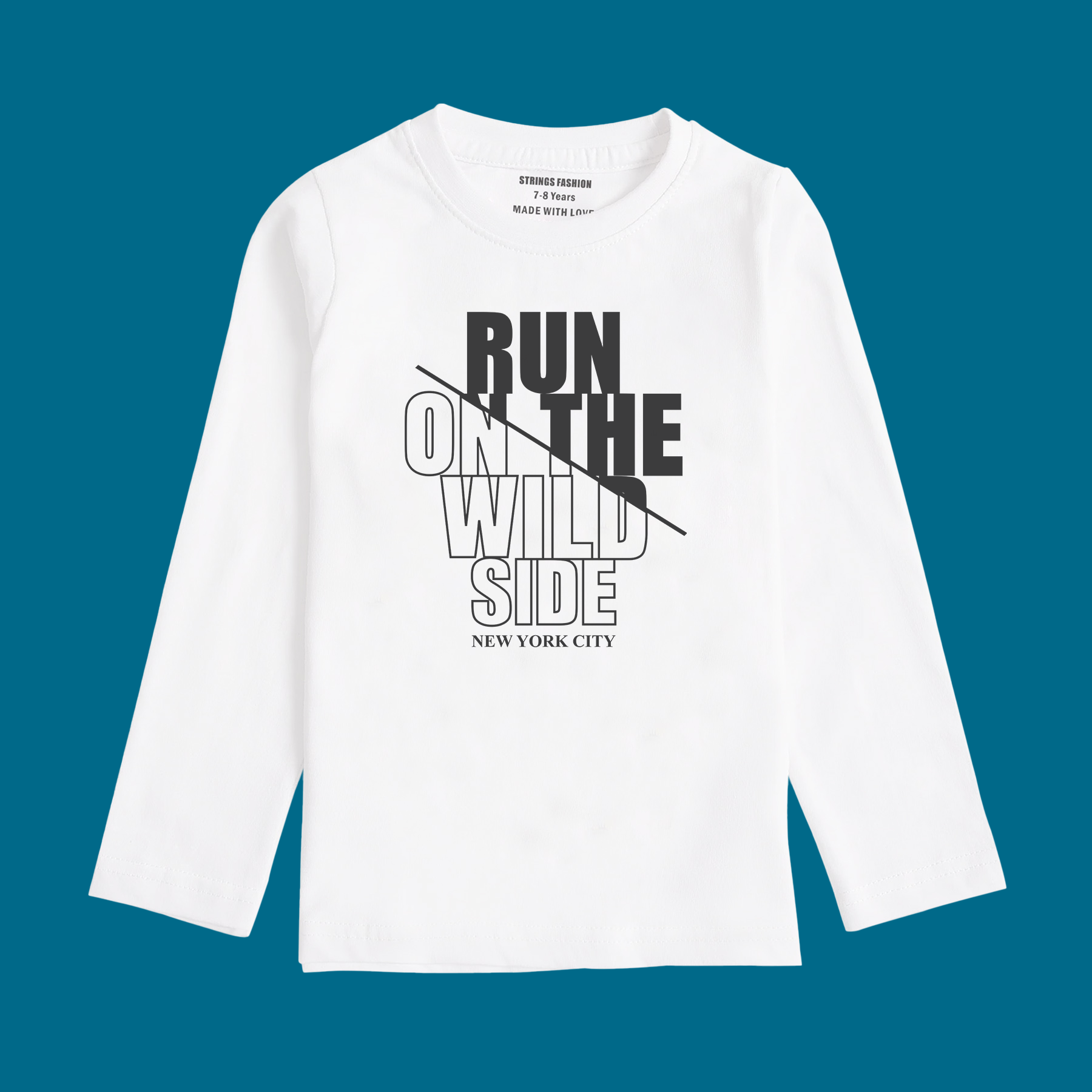 This boys' long sleeve T-shirt is crafted from 100% white cotton, ensuring breathability and comfort for active wear. Featuring the "Run Out on the Wild Side" print, it combines style with durability, making it ideal for everyday adventures. Its soft fabric and classic fit provide ease of movement while maintaining a clean, crisp look. Perfect for layering or wearing alone, this T-shirt offers both practicality and a bold statement for young boys.