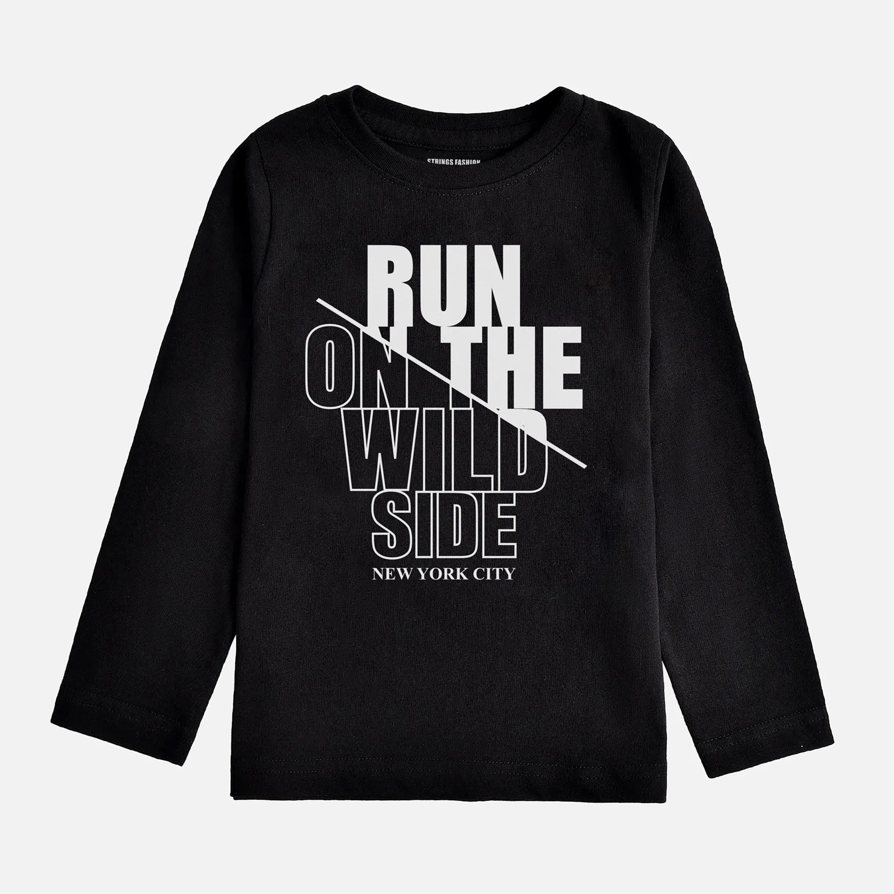 This jet black boys' long sleeve T-shirt is crafted from 100% cotton, ensuring comfort and breathability. Featuring a digital print with a "Run on the Wild Side" design, it combines style with durability, making it ideal for active kids who want to express their adventurous spirit. The soft fabric and long sleeves provide warmth and flexibility for everyday wear.