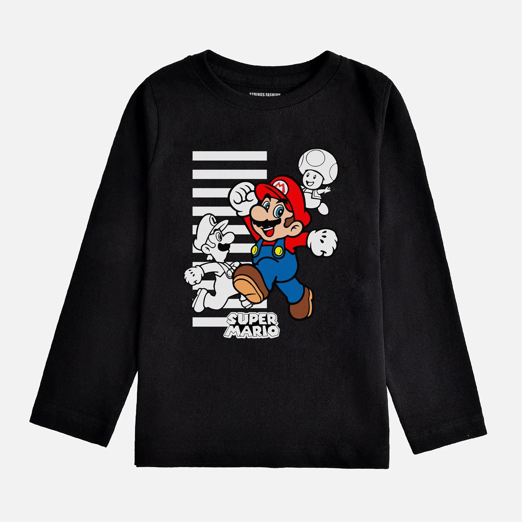 This boys' long sleeve T-shirt features a digital Super Mario print on jet black, 100% cotton fabric. Designed for comfort and durability, it offers a soft feel and breathability ideal for active kids. The classic fit ensures ease of movement, making it perfect for everyday wear.