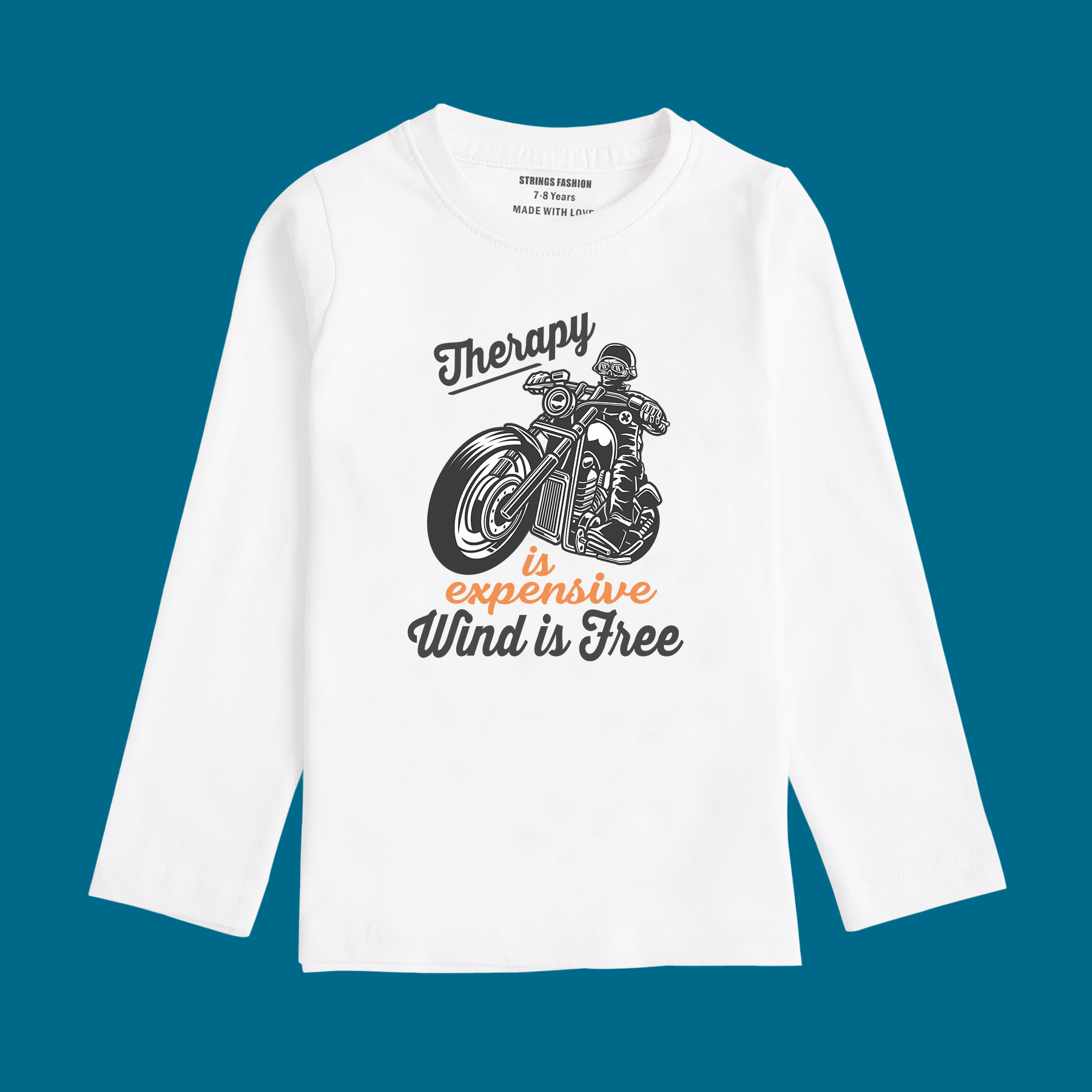 This boys' long sleeve T-shirt features a crisp white color crafted from 100% cotton, ensuring breathability and comfort. The standout therapy bike print adds a unique, stylish touch, making it perfect for casual wear while providing softness and durability suitable for active kids.