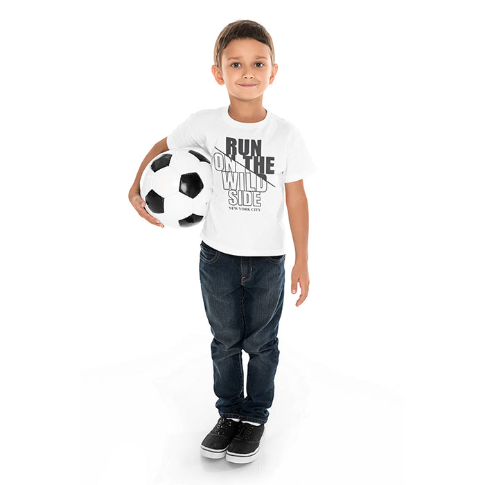 Crafted from 100% pure white cotton, this junior boys' T-shirt offers exceptional comfort and breathability. Featuring a bold "Run on the Wild Side" print, it combines style with durability, making it ideal for active youngsters who value both fashion and functionality. Its soft fabric ensures all-day wear ability, perfect for casual outings or playtime.