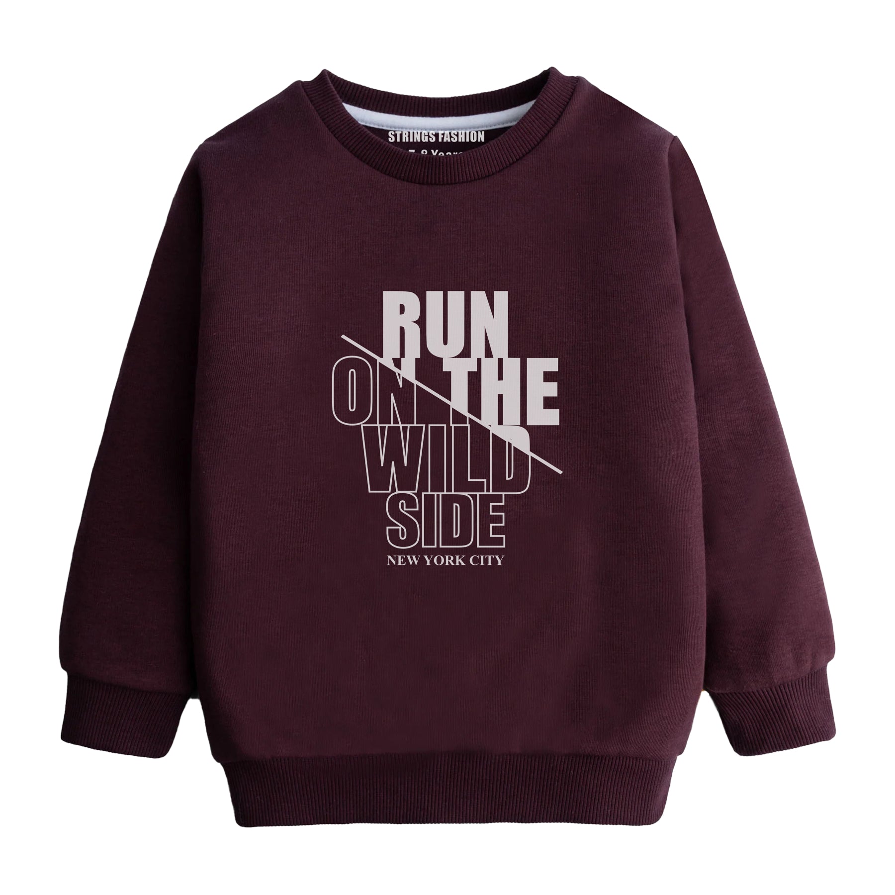 The "Run on the Wild Side" boys' long sleeve sweatshirt in rich mahroon color combines comfort and durability, perfect for active youngsters. Crafted with soft, breathable fabric, it ensures all-day warmth without restricting movement. Its long sleeves provide extra coverage, making it ideal for cooler days, while the bold color adds a stylish edge to any casual outfit. A practical choice for layering or solo wear, this sweatshirt supports both playtime adventures and everyday comfort.