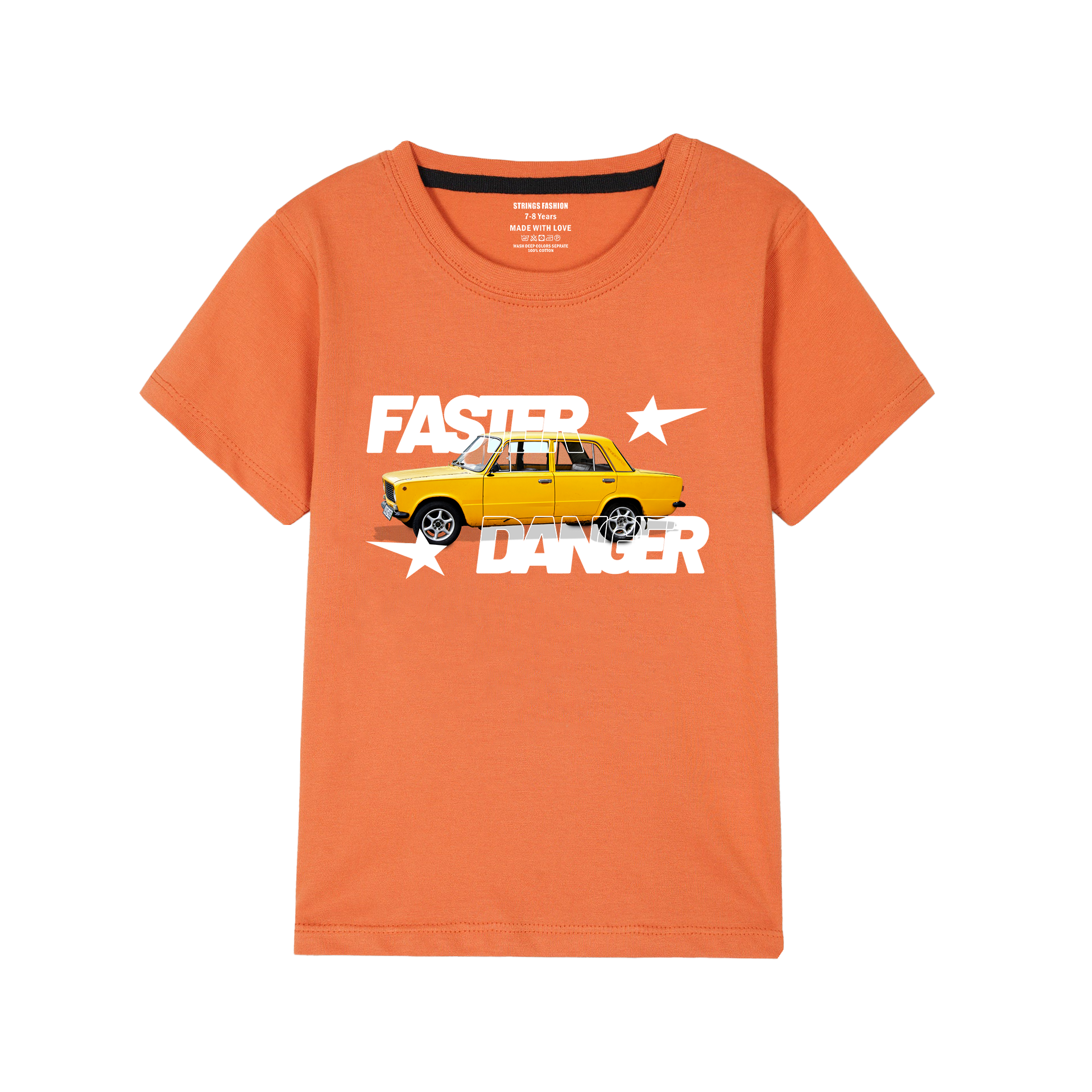 This vibrant orange boys' T-shirt features a bold "Faster Danger" print, combining style with a dynamic edge. Crafted for comfort and durability, it is ideal for active youngsters who want to stand out. The bright color enhances visibility, making it a practical choice for everyday wear. Perfect for casual outings or playtime, this T-shirt offers both fashion and function.