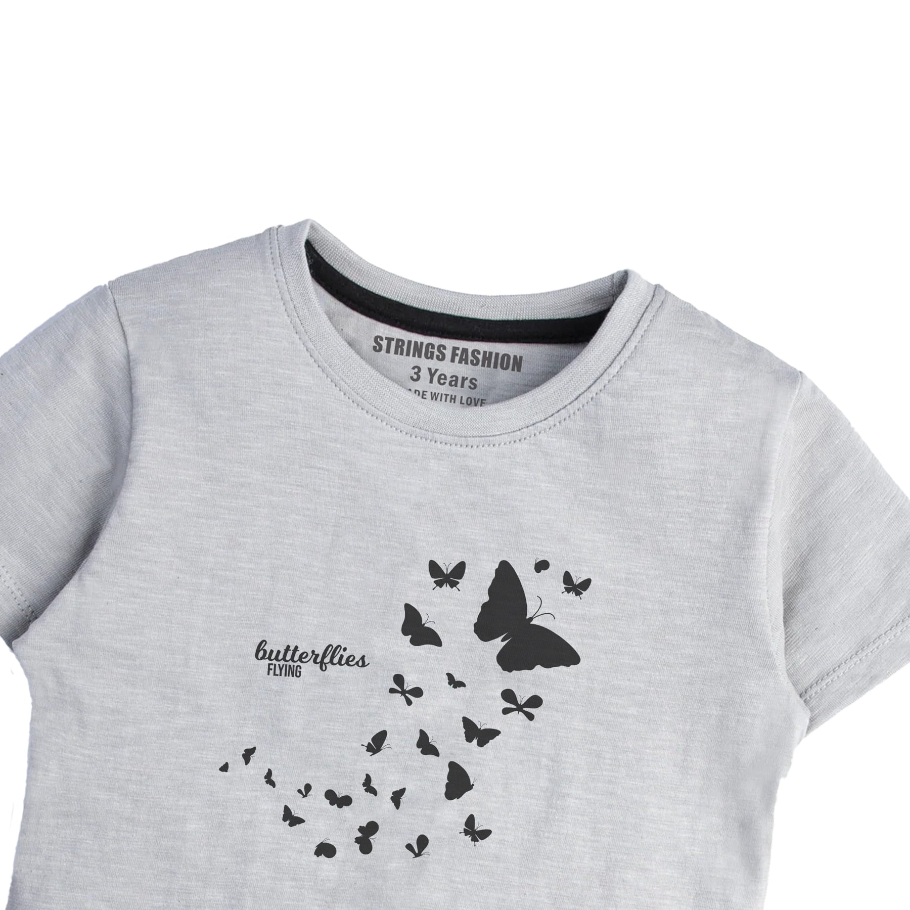 This grey short sleeve t-shirt features a delicate butterflies print, designed specifically for girls. Crafted for comfort and style, it offers a lightweight feel suitable for everyday wear. The breathable fabric ensures ease of movement, making it an ideal choice for active children who want both functionality and a charming look. Perfect for pairing with casual outfits, this shirt adds a subtle, playful touch to any wardrobe.