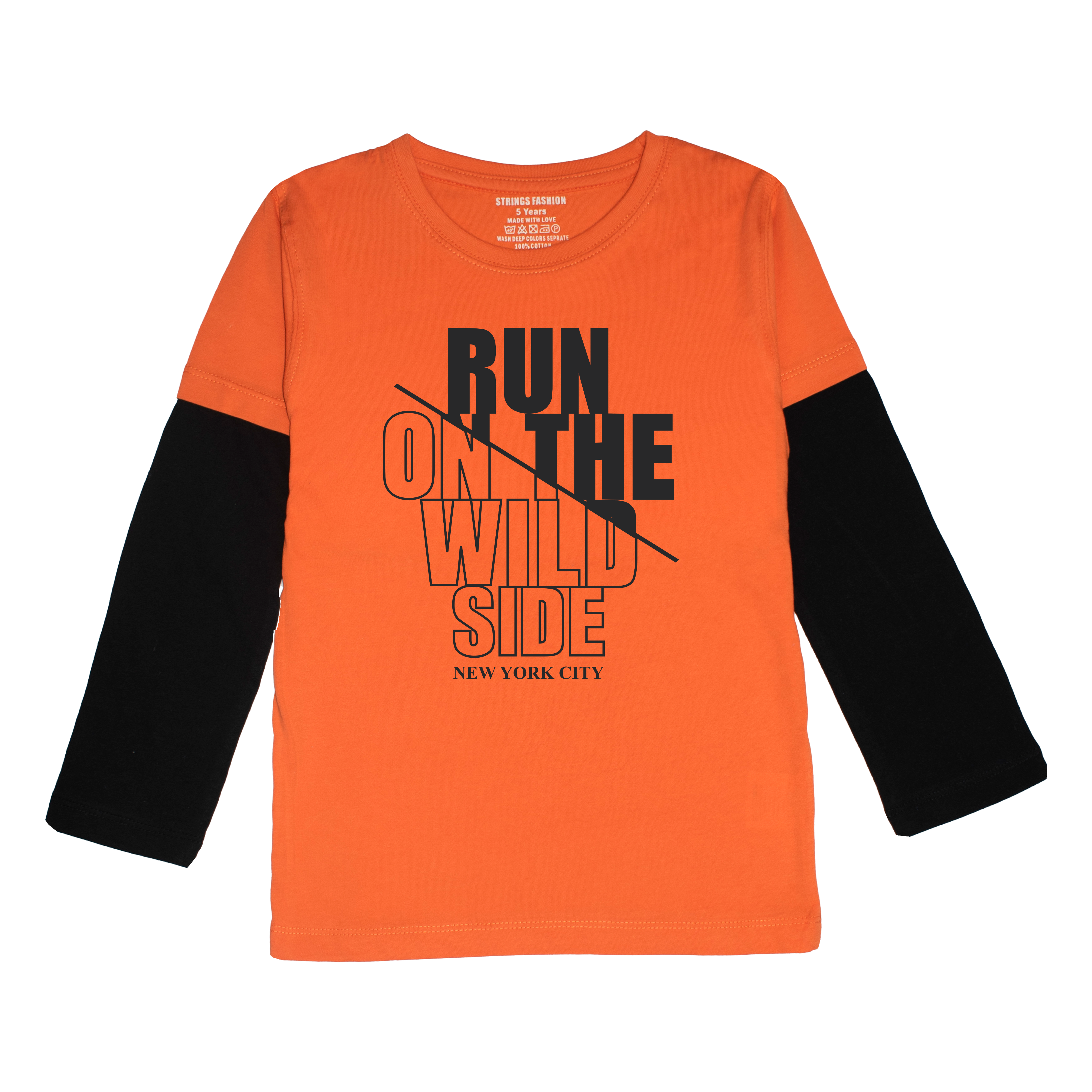 This boys' long sleeve t-shirt features a vibrant orange and black "Run on the Wild Side" print, crafted from 100% cotton for superior comfort and breathability. Designed to keep young adventurers comfortable throughout the day, its soft fabric ensures durability and ease of movement, making it ideal for active wear. The bold design adds a stylish edge to casual outfits, perfect for everyday wear or outdoor play.