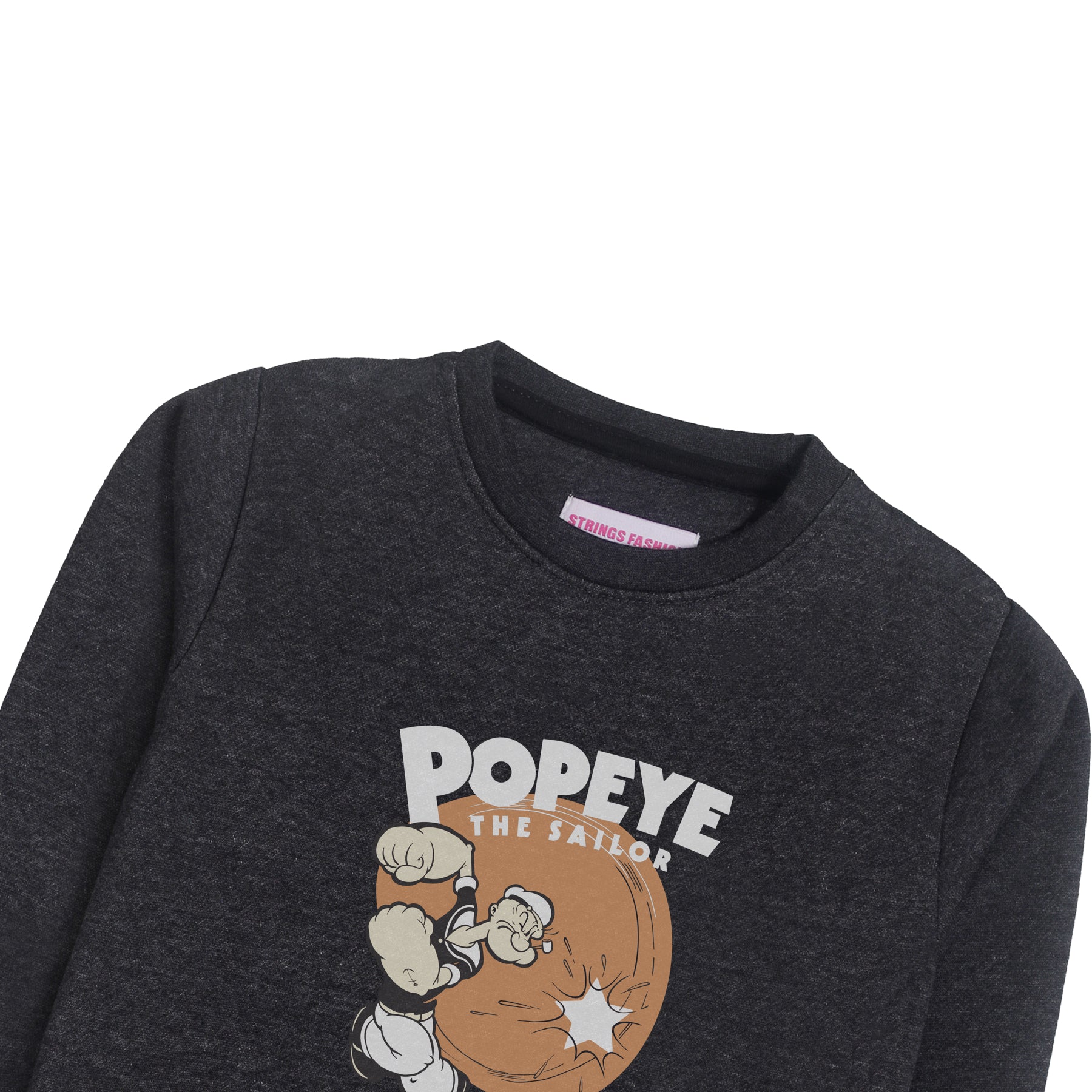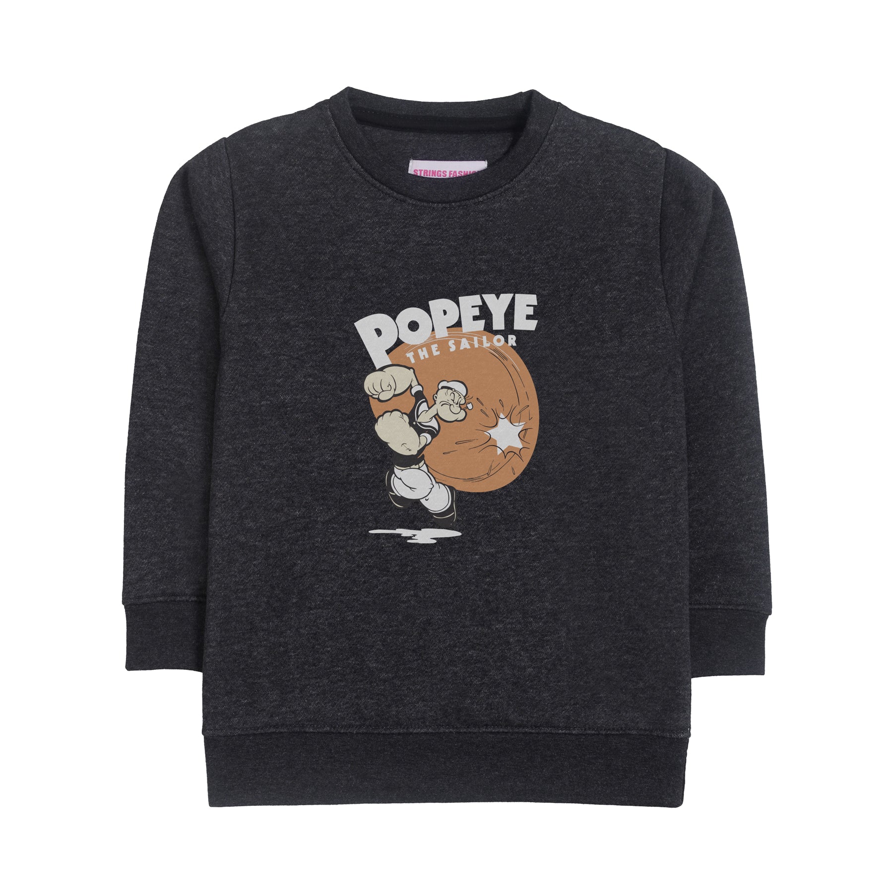 This Popeye charcoal long sleeve sweatshirt for boys offers a comfortable and durable fit ideal for everyday wear. Crafted with soft fabric, it ensures warmth and ease of movement during cooler days. Featuring a timeless design inspired by the classic Popeye character, it combines style with reliable quality, making it a practical addition to a young wardrobe.