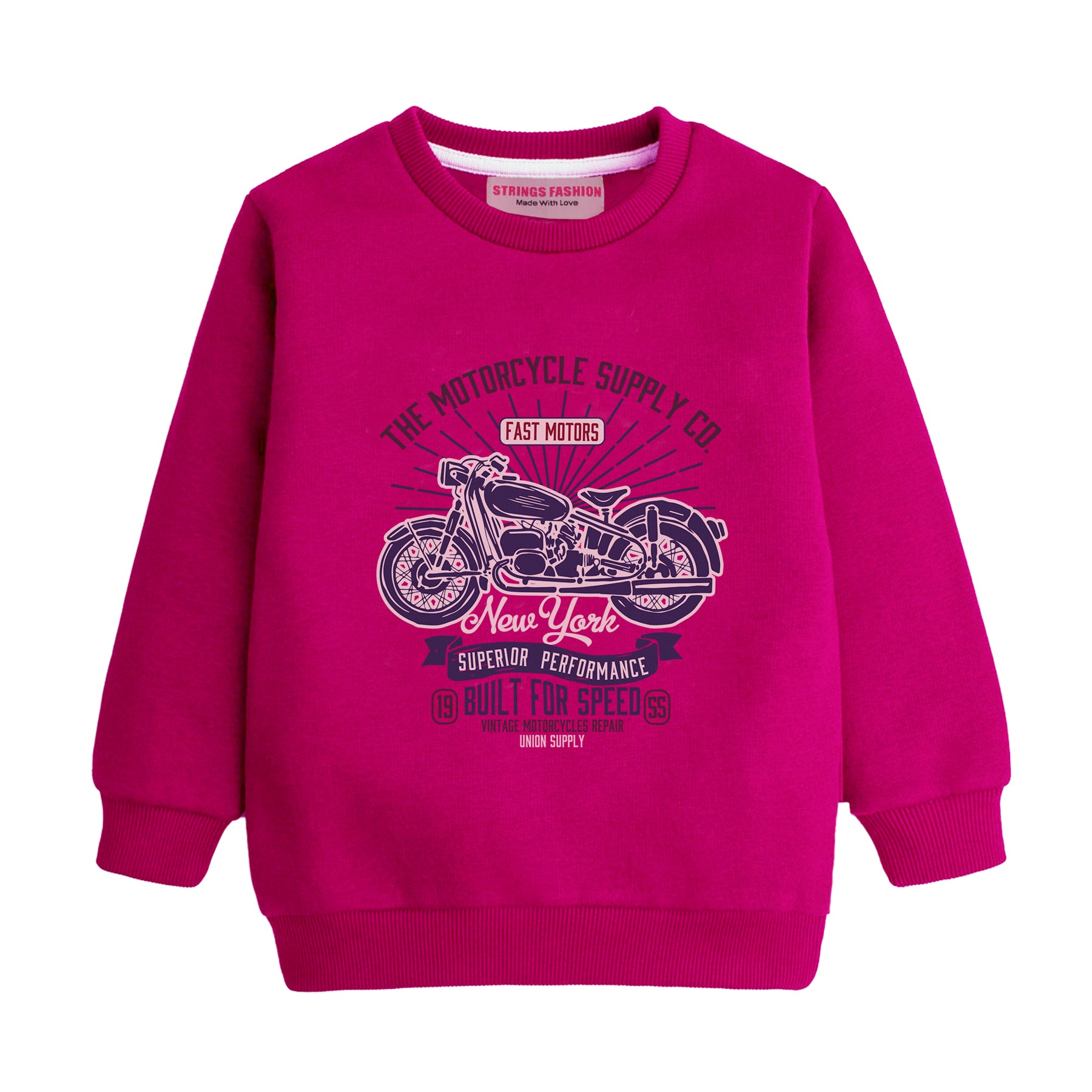 This boys' long sleeve sweatshirt features a striking red base adorned with a bold blue motorcycle graphic, combining style and comfort for everyday wear. Crafted for durability and warmth, it’s ideal for active kids who want to express their adventurous spirit while staying cozy during cooler days. The sweatshirt’s design ensures easy layering, making it a versatile addition to any child’s wardrobe.